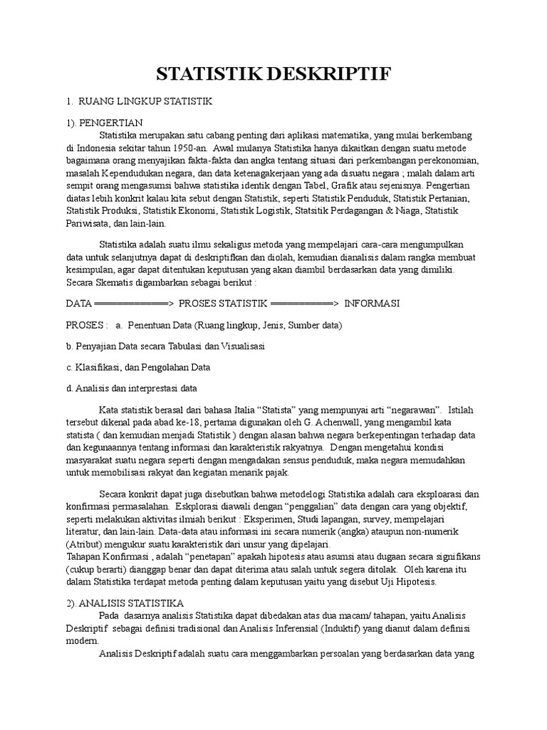 Langsung saja simak pembahasan di bawah ini…? Statistika deskriptif membahas bagaimana data dapat digambarkan dan dideskripsikan atau disimpulkan, baik secara numerik maupu variable untuk mendapatkan gambaran sekilas tentang data tersebut, sehingga lebih mudah dibaca dan mempunyai makna. Selain itu ruang lingkup juga kerap kali dipakai dalam sebuah karya ilmiah. Pengklasifikasian menjadi statistika deskriptif dan statistika inferensi dilakukan berdasarkan aktivitas yang dilakukan. Statistik deskriptif adalah salah satu bagian dari ilmu statistika yang berhubungan dengan aktivitas penghimpunan, penataan, peringkasan dan. Ruang lingkup statistik infernsial yaitu probabilitas, metode sampel, pengujian hipotesis, statistik parametrik (korelasi dan regresi), dan statistik nonparametrik. Statistik diskriptif kegiatan statistik yang dilakukan meliputi pengumpulan data, pengolahan data, penyajian data, dan penyimpulan data untuk mencari. Terminologi ruang lingkup kerap kali dipakai pada saat seseorang melakukan suatu pengkajian atau penelitian. Data sampel, kemudian melakukan inferensi terhadap populasi data berdasar pada informasi (hasil statistik deskriptif) yang terkandung dalam sampel. Namun dalam pembahasan kali ini kita akan membahas statitiska deskriptif secara lengkap. Nilai tengah (mean, median perbedaan antara statistik parametrik dan statistik nonparametrikstatistik parametrikdistribusi normal atau diasumsikan normaldata bersifat kuantitatif. Didasarkan pada ruang lingkup bahasannya statistik deskriptif. Data (populasi/sampel)secara konkrit dapat juga disebutkan bahwa metodelogi statistika adalah cara eksploarasi dan konfirmasi permasalahan.
